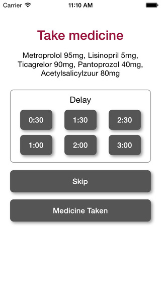 - Possibility for repeating medicines, with a fixed time to take the first medicine and fixed time-intervals after that. For example from 08:00 each 2 hours.